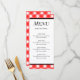 Una tarjeta de menú personalizado para cumpleaños, barbacoa, celebraciones o restaurantes con letras de bloque en un patrón retro rojo y blanco trenzado marcado con rayas anchas y delgadas, puede personalizar este diseño para añadir su propio logo, cambiar fuentes, incluso guardar su diseño para más adelante.