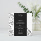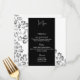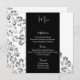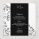 Esta plantilla de tarjeta de menú se muestra en el papel básico con un diseño de impresión floral, guión y texto estándar en blanco. Colores Negro, Gris, Blanco Personalizar los elementos del menú en el tuyo haciendo clic en el botón personalizar, mira a la derecha y encuentra los cuadros apropiados para cambiar a tu información. Deseándote los mejores deseos para tu Día de la Boda. Imagen de stock