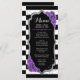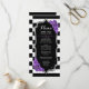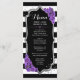 Tarjeta de menú. Diseño negro, blanco y púrpura con falso brillo. Cuenta con rayas negras y blancas, letra script y rosas púrpuras. Perfecta para una fiesta elegante.