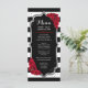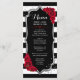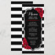Diseño elegante de negro, blanco y rojo con falso brillo plateado. Rayas negras y blancas con rosas rojas. Perfecto para una fiesta elegante.