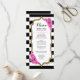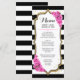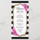 Tarjeta de menú. Diseño elegante en negro, blanco y rosa con brillo dorado falso. El diseño floral presenta rayas negras y blancas, letra script y rosas rosadas. Perfecto para una fiesta elegante.
