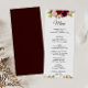 Esta sencilla carta de menú con flores de Borgoña es perfecta para un simple boda. El diseño ilustrado elegante y radiante presenta un color melocotón, rojo oscuro, rosa, blanco, acuarela, flores borgoñas y prístinas cuidadosamente agrupadas en un impresionante ramo sobre una cama de vegetación deslumbrante. Este menú se puede utilizar para la recepción de bodas, la cena de ensayo, la ducha de novia o cualquier otro evento.