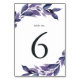 Las elegantes tarjetas botánicas de número de mesa cuentan con rociadores de hojas botánicas vibrantes azules y violetas alrededor de su número de mesa. El diseño se repite al revés. Coordina con nuestra colección de eventos Abundant Foliage Violet.