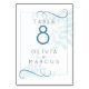 Número de tabla de boda | Moda y follaje sencillo, azul pálido detrás del texto con un marco delgado y remolinos de color azul ahumado verde azulado al acento - Esto forma parte de una suite boda coordinada.