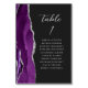 El borde izquierdo de esta elegante y moderna tarjeta boda número de mesa cuenta con un borde de agate color morado con un falso purpurina plateado. La palabra "tabla" aparece en el guión de escritura a mano gris plateado en un fondo no negro. Agregue los nombres de los invitados que se asignen a cada mesa.