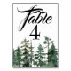 Esta elegante tarjeta numérica presenta una imagen de color de agua de un bosque de pinos del noroeste del Pacífico. Un hermoso paisaje de pinos verdes bordea la parte inferior de la carta de la mesa.
