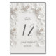 Números de mesa de boda con rosas 3D esculpidas blancas en arco.