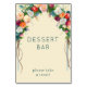 Este letrero de mesa para bodas presenta un encantador diseño de arco floral con una variedad de flores y follaje coloridos, creando una atmósfera vibrante y acogedora. La disposición es equilibrada, con el texto "DESSERT BAR" que se muestra de manera prominente en una tipografía serif, seguido de "please take a treat!" en un estilo sans-serif más simple, ambos en un color azul verdoso suave que contrasta hermosamente con el fondo crema. La técnica de ilustración digital le da un aspecto pulido y moderno, perfecto para agregar un toque de elegancia a su celebración. Ideal para bodas o reuniones festivas, este letrero establece un ambiente alegre y acogedor, alentando a los invitados a disfrutar de dulces golosinas.