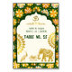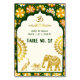Esta tarjeta de número de mesa personalizable para una boda hindú tradicional elegante presenta un diseño rico en esmeralda y maravilla con un arco mogol marfil, hermosamente acentuado por detalles dorados de loto, pavo real, elefante y un símbolo Om. Sus nombres, fecha de la boda y número de mesa se muestran en la parte frontal y posterior en un diseño lujoso y festivo.