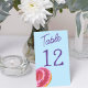 Número de tabla Baby Shower azul lindo con un donut rosado en acuarela. Es muy fácil de personalizar, con su número de mesa.