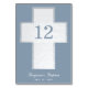 Un número de mesa para el bautizo de un niño, con colores azul polvo, blanco y falso plata. El número es azul polvo, en el centro de una cruz sobre fondo de lámina de falso plata, En la parte inferior, debajo de la cruz, hay un texto blanco sobre fondo azul polvo, el nombre y la ocasión en una escritura elegante, la fecha en mayúsculas. Los otros bordes también son azul polvo.