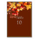 Lovely table number card with warm shades of yellow, red, orange and green Autumn leaves with sprigs of berry branches. Choose your favorite font and color.