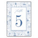These elegant timeless coastal wedding table number cards feature a seaside toile de jouy pattern of hand drawn lighthouses, sailboats, and ocean waves, reminiscent of summer on the New England coast.