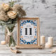 This Blue Orange Floral Elegant Fiesta Spanish Wedding Table Number design features an intricate floral pattern that wraps around the border, showcasing delicate blue and orange flowers interwoven with curling vines and leaves. The color palette, consisting mainly of soft blues with touches of warm orange, creates a harmonious contrast, evoking a hand-painted, artisanal quality. The symmetry of the design along with the detailed floral motifs adds a traditional, handcrafted charm, reminiscent of Mexican folk art.