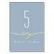 Sencillo, minimalista, moderno, elegante número de mesa de boda azul polvo con corazón de cuerda dorada romántica y nombres de novia y novio.