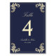 Elegante tarjeta de boda azul marino y barroco dorado, perfecta para guiar a los clientes hasta sus asientos en la recepción. Diseñado con florecientes doradas y detalles de personalizable, este número de mesa es ideal para bodas formales, de lujo y clásicos. Se coordina con la suite nupcial completamente azul marino y barroco dorado para un aspecto cohesivo.