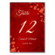 Estas tarjetas de número de tabla boda china presentan hermosas flores rojas de cerezo y un símbolo rojo de doble felicidad sobre un fondo rojo de rubí resplandeciente.