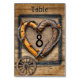 Tarjeta de mesa de boda rústica de campo con forma de corazón, marco de rama de madera para sus tarjetas de número de mesa y rueda de carro con herradura de plata.