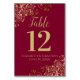 Estas hermosas tarjetas bodas con números de mesa presentan un diseño sencillo pero elegante con caligrafía de escritura dorada sobre un fondo rojo de burdeos o ladrillo marrón con un floral de Relieve metalizado de imitación dorada en las esquinas. La forma perfecta de hacer que su recepción de bodas sea hermosa y ayudar a sus huéspedes a encontrar la mesa correcta al mismo tiempo.