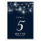 Tarjetas de número de tabla boda impresas a precios asequibles con una plantilla DIY simple para personalización. Este diseño rústico de moda presenta varias cadenas de brillantes luces de cuerda y tarros de albañil sobre un fondo azul marino oscuro. Personalice cada número de tabla que necesite y añada cada uno a su carrito de forma individual (nota: si agrega un gran número de tarjetas a su carrito se imprimirá con el mismo número). Utilice las herramientas de diseño para elegir los tipos de letra y colores que desee o para subir sus propias fotos para hacer un diseño único para su decoración de mesa boda.