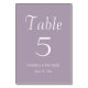 Los huéspedes de la recepción de bodas podrán ir a la mesa con esta sencilla tarjeta de números de mesa con letras blancas y estilizadas sobre un fondo de color malva a la moda. El diseño está a cada lado de la tarjeta. Edite su tarjeta para cambiar el número de tabla, los nombres de la pareja de bodas y la fecha . Ordenar las tarjetas por separado para cada número de tabla.
