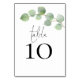 Boda de escritura moderna de eucalipto. La tabla se establece en un script de estilo de escritura a mano y su número de tabla debajo con una follaje acuarela elegante en la parte superior desde la derecha. Personaliza fácilmente el número. El mismo diseño está en el otro lado y se actualizará simultáneamente a medida que realice el cambio al número.