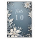 Mágicos números de mesas de bodas de invierno, con un fondo azul helado con flores de invierno y follaje crujientes.