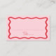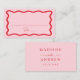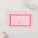 Añada un toque elegante a su recepción de bodas o evento especial con estas modernas tarjetas de boda Wavy Frame. El diseño retro muestra "Table" en un guión rojo manuscrito con espacio para que escriba el nombre y el número de tabla de su invitado. Un borde rojo ondulado rodea el diseño contrastando con un fondo rosa claro. En la parte posterior de la tarjeta de plaza plana aparecen sus nombres y la fecha del boda con letras rojas en negrita.