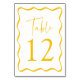 Añada un toque elegante a su celebración boda con estas tarjetas de mesa boda Wavy Frame Moderno. El diseño retro muestra "Table" en un guión amarillo escrito a mano con el número de tabla que se muestra a continuación. Un borde ondulado amarillo rodea el número de tabla contrastando con un fondo blanco. El diseño se repite en la parte posterior. Para solicitar las tarjetas de la tabla: agregue cada número a su carrito individualmente y desprotéjase cuando haya terminado. No realizar el pedido por cantidad o recibirá múltiplos del mismo número.