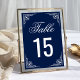 Elegantes tarjetas de números de mesa con un elegante borde blanco ornamentado contra un fondo azul oscuro.