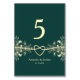 Elegante tarjeta de mesa verde esmeralda y boda dorado con acentos florales y un romántico diseño coronario de cuerda. Perfecto para ayudar a los huéspedes a localizar fácilmente sus mesas en la recepción. Ideal para bodas elegantes, modernos o clásicos en cualquier época del año. Personalice con sus números de tabla y detalles del boda. Este diseño se coordina de manera muy bonita con invitaciones, tablas de asientos, menús, programas y papel de la colección de bodas de esmeralda y oro.