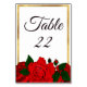 Para la pareja elegante, tradicional y romántica a la que le gustan las fuertes y audaces rosas rojas pasión, delicadamente colocadas sobre un delgado marco dorado. Las rosas rojas son tradicionalmente un símbolo de amor. Tipo de letra de script romántico para los números de tabla. Esta tarjeta boda del número de la tabla forma parte de la colección Boda Passion Red Roses que incluye tarjetas RSVP, carteles de recepción, fondo de fotos, tarjetas de agradecimiento y más, todo con detalles florales coincidentes. ¡Felicitaciones a tu boda!
