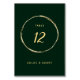 Este número de tabla boda presenta un marco de círculo dorado falso y una caligrafía simple con un fondo verde forestal.