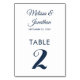 Tarjeta de número de tabla minimalista simple y elegante con un elegante guión azul oscuro sobre un fondo blanco clásico. Personalizable fácil con los nombres de la novia y del novio, la fecha del boda y el número de la tabla. Para mayor personalización o pedidos de personalizados, no dudes en contactarme en acherryonthecake@hotmail.com (por favor, espere entre 1 y 2 días hábiles). Esta tarjeta de número de tabla forma parte de la colección "Delicate Orchids - Prussian Blue boda suite" con muchos elementos de coordinación para crear una suite boda única.