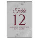 Haz que la recepción de tu boda sea hermosa con estas tarjetas de número de mesa. Presentan un diseño sencillo pero elegante con texto burdeos o marrón sobre un fondo gris con un Relieve metalizado falso plateado con un borde floral.