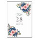 Tarjetas de número de mesa de boda florales de color rosa y azul marino personalizables según los detalles de su evento.
