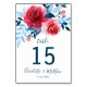 Diseño de números de tarjetas de mesa de boda sencillo pero elegante con rosas y follaje de color rojo y azul. El mismo diseño se repite al revés.
