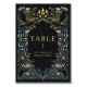Elegante y gótico diseño boda con arvejas y follaje. Este diseño presenta un fondo negro, con barrancos azules oscuros y hojas verdes mudas con acentos dorados. Artículos coincidentes en nuestra tienda para un tema fiesta completo. El diseño no es un verdadero Relieve metalizado. Los elementos se imprimen exactamente como aparecen en la pantalla cuando se agregan al carrito, por lo que se personaliza y se agrega cada número de tabla que se necesita a su carrito individualmente