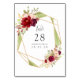 Tarjetas de número de mesa de boda rosadas y borgoña (marsala) con marco geométrico de purpurina dorada diseñadas para ser personalizadas rápida y fácilmente según los detalles de su evento.