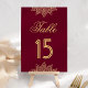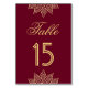 Tarjeta de número de mesa elegante con un elegante arte de henna sobre un fondo borgoña.