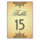 Número de mesa de boda tradicional con un elegante arte de henna sobre un fondo de pergamino vintage.