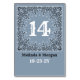 Una polvorienta señal de número de mesa de bandana azul para su país o boda occidental o rústico. Añada un toque occidental personalizado único a su ambiente rústico de mesa. Esto complementará tu rancho, granja, granero o un tema del desierto y llevará a todos los vaqueros o vaqueras a sus mesas. Diseño auténtico, detallado en blanco y negro con corazones sobre un polvoriento fondo azul. El lado delantero tiene el número de la tabla en blanco y el lado inverso tiene un número de tabla en negro. El número de tabla, los nombres y la fecha del evento pueden ser peresonalizados. Puede personalizarse fácilmente según los colores de su boda en la Herramienta de diseño