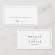 Esta minimalista tarjeta boda plana es perfecta para una simple recepción nupcial. El moderno diseño romántico presenta una tipografía clásica en blanco y negro, acompañada de una caligrafía rústica y elegante con un estilo de letra a mano vintage. Personalizable de cualquier color. Mantenga el diseño simple y elegante, tal como está, o lo personaliza añadiendo sus propios gráficos y obras de arte. Personalice la parte posterior de las tarjetas del lugar con los nombres de la novia y del novio y la fecha. Compra a granel y escribe a mano los nombres de los invitados y los números de tabla en las tarjetas impresas cuando lleguen.