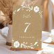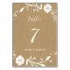 Este número de mesa boda presenta una corona blanca floral rústica sobre un fondo de papel imitación marrón.