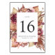 Elegante, postre, floridas tarjetas boda de mesa con flores de color burdeos, violeta, rubia y coral acuarela y frondosos follajes en ricos tonos de tierra marrón. Personalice agregando el número de tabla, sus nombres, fecha de boda, etc. El diseño se repite al revés. Se coordina con nuestra suite de invitados Boho Desert Floral.