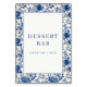 Esta elegante señal para la mesa de la boda presenta una paleta de colores clásica azul y crema, con un patrón floral simétrico que bordea el espacio blanco central. El diseño muestra peonías y follaje detallados en un estilo de porcelana vintage, creando una apariencia encantadora y sofisticada. La tipografía serif en mayúsculas y negrita anuncia "BAR DE POSTRES" seguido de un mensaje invitador para los invitados. Perfecta para agregar un toque de elegancia y alegría a tu estación de postres, esta señal fomenta la interacción con su tono amigable.