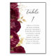 Esta elegante y moderna tarjeta boda cuenta con un borde de flores borgoñas y hojas de Relieve metalizado de imitación dorada. La palabra "tabla" aparece en el guión de escritura a mano gris carbón en un fondo blanco. Agregue los nombres de los invitados que se asignen a cada mesa.