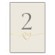 Sencillo, minimalista, elegante, número de mesa de boda beige neutral con corazón de cuerda dorada y caligrafía moderna.