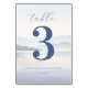 This wedding table card features a serene and minimalist design with a calming blue and white color palette, creating an elegant and tranquil atmosphere. The layout includes a large, bold numeral "3" in deep navy blue, complemented by the word "table" written in an elegant cursive script above it. Below the number, customizable placeholders for names and dates are presented in a clean sans-serif font, ensuring clarity and symmetry. The background showcases soft, layered mountain silhouettes, adding depth and a touch of nature to the modern yet classic style, making it perfect for formal occasions.