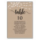 Tarjeta de tabla de mesa de boda para la cena, guión rústico moderno, luces de cadena, fondo de kraft marrón Personalizar el texto y / o eliminar y rellenar con el tema de tu fiesta de boda.